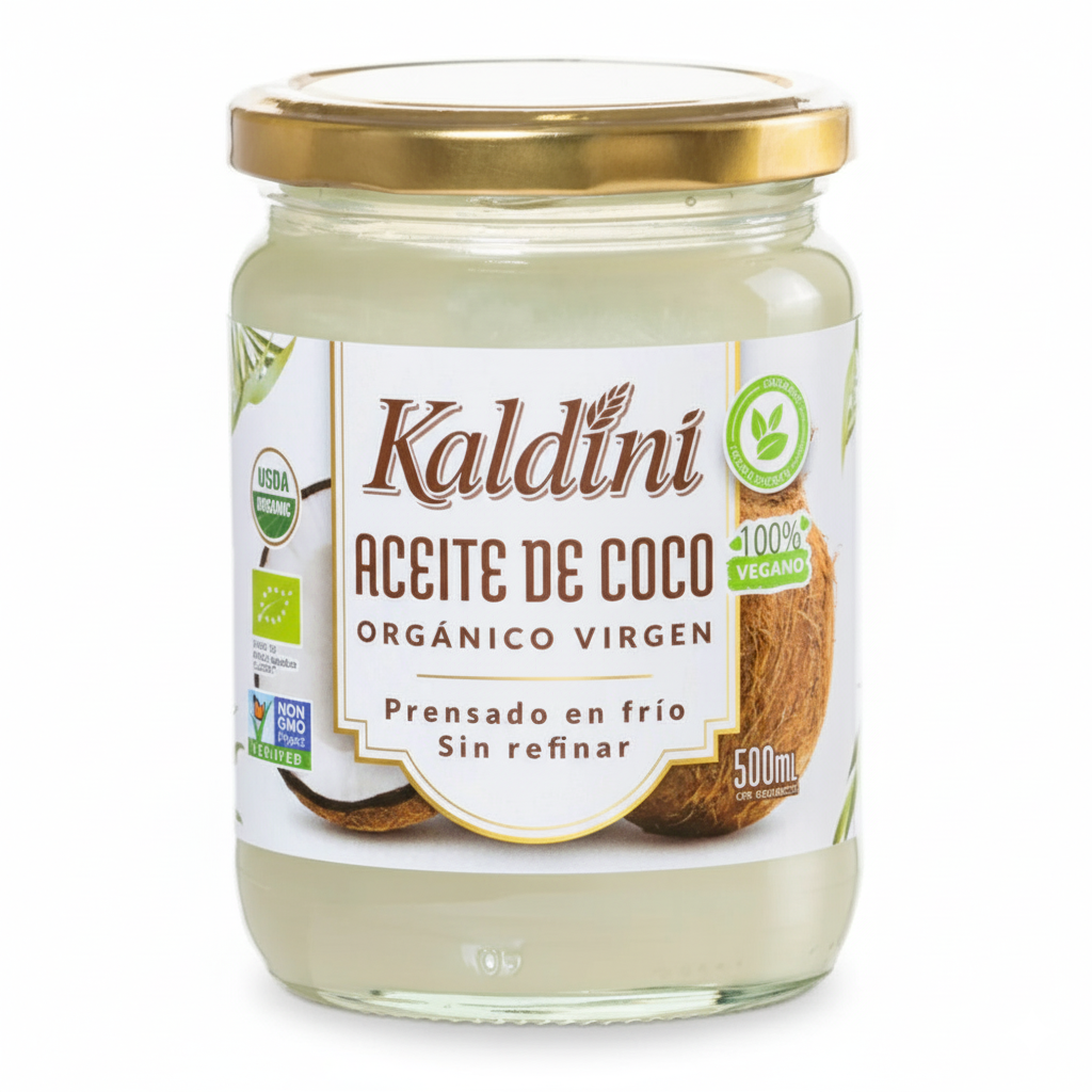 El Aceite de Coco Virgen Orgánico Kaldini en presentación de 500 gramos es un producto comestible de alta calidad, clasificado como un superalimento por su composición nutricional. Este aceite se obtiene mediante prensado en frío de cocos frescos, asegurando la conservación de sus propiedades naturales.Ingredientes:Aceite de Coco Virgen Orgánico (100%)Características Destacadas:Procesamiento: Es Virgen y Sin Refinar, por lo que conserva el característico sabor y aroma natural a coco.Composición: Rico en Triglicéridos de Cadena Media (TCM), principalmente ácido láurico, que son metabolizados rápidamente para proporcionar energía.Pureza: Certificado como Orgánico y apto para personas que siguen dietas Veganas y Cetogénicas (Keto). Es libre de colesterol.Versatilidad: Ideal para cocinar a fuego medio (resiste bien el calor antes de alcanzar su punto de humo), para la repostería y como sustituto saludable de grasas menos densas en nutrientes. También es popular para el cuidado de la piel y el cabello.