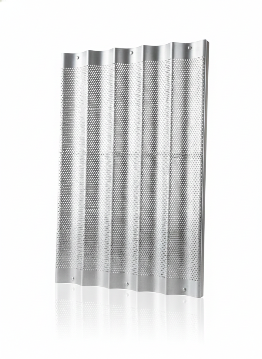 La Bandeja Acanalada Perforada ALUMWARE de 65×45 cm es un equipo indispensable en panadería y pastelería industrial, especialmente diseñado para optimizar el rendimiento y la calidad de los productos horneados en hornos rotativos.Esta bandeja combina dos características clave: el diseño acanalado para estructura y el perforado para ventilación superior.Características Profesionales Destacadas:Dimensiones Estándar: Con medidas de 65 x 45 cm (o 66 x 45.6 cm), encaja perfectamente en los tamaños de hornos rotativos y carros de transporte profesionales.Material de Construcción: Fabricada en Aluminio de alta calidad (a menudo aleación $3003 H14$), lo que garantiza una excelente conducción de calor y una estructura resistente que soporta las altas temperaturas del horneado.Diseño Acanalado: Cuenta con canales longitudinales (típicamente 5) que proporcionan rigidez estructural a la bandeja, previenen la deformación por el calor y facilitan la manipulación de piezas de panadería (como baguettes o panes alargados).Microperforaciones: Incorpora un sistema de microperforaciones (generalmente de 2.8 mm) en toda su superficie. Esta característica es crucial, ya que maximiza el flujo de aire caliente alrededor del producto.Beneficios para el Producto Final:Corteza Crujiente: La perforación permite que la humedad se evapore rápidamente de la base de las masas, resultando en cortezas inferiores más uniformemente doradas y crujientes.Cocción Homogénea: El máximo flujo de aire asegura que el calor envuelva la masa por igual, evitando puntos fríos.Durabilidad: Su construcción robusta y bordes reforzados garantizan una larga vida útil incluso bajo uso constante.
