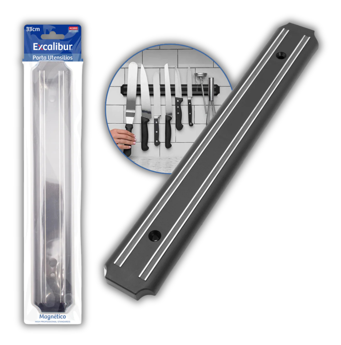 Organice su cocina de forma eficiente y segura con la barra magnética Excalibur de 33 cm. Esta herramienta esencial, fabricada con un potente imán y materiales de alta calidad, le permite almacenar y exhibir sus cuchillos y utensilios de metal de manera ordenada, liberando espacio en cajones y encimeras.Su diseño minimalista y elegante se adapta a cualquier estilo de decoración, y su instalación es rápida y sencilla. La barra magnética garantiza que sus herramientas de corte estén siempre al alcance de la mano y seguras, evitando daños a las hojas y accidentes. Una solución práctica y moderna para mantener la organización y la funcionalidad en su cocina.