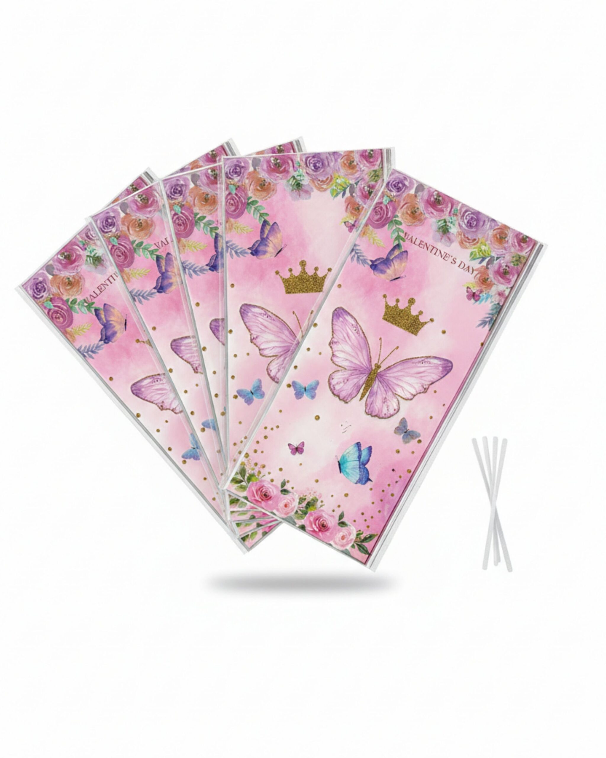 Añade un toque de sofisticación y encanto natural a tus detalles con nuestro Set de Bolsas Premium de Mariposas. Este modelo destaca por su delicada ilustración de estilo acuarela, que combina mariposas monarca en tonos lila, coronas doradas y arreglos florales de rosas. Es la opción ideal para quienes buscan una estética elegante y femenina, perfecta no solo para San Valentín, sino también para bodas, bautizos, o eventos de primavera.
