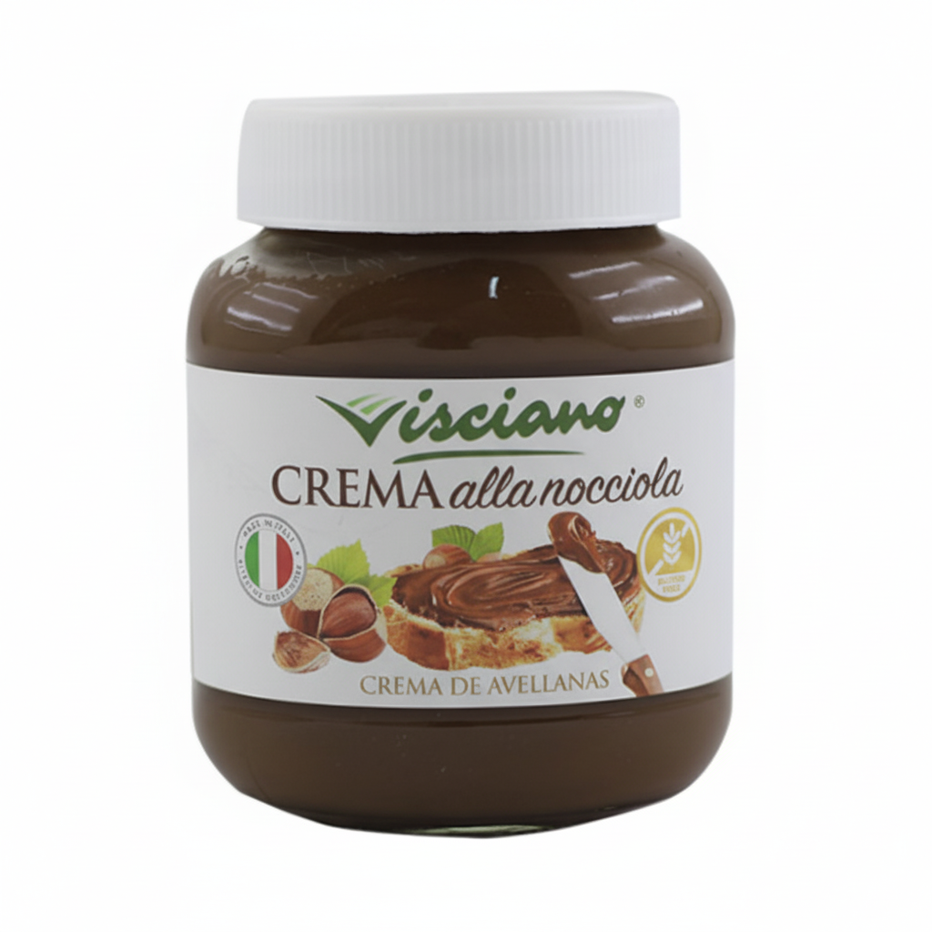 La Crema de Avellana Visciano en tarro de 400 gramos es una popular crema untable, dulce y cremosa, que destaca por el sabor intenso de las avellanas. Aunque Visciano es una marca italiana que produce variedad de untables (incluyendo versiones con cacao), esta descripción se centra en la crema pura o con avellanas como ingrediente principal.Ingredientes Típicos (para cremas de avellana dulces):Azúcar o edulcorantes.Avellanas (el porcentaje puede ser variable y suele ser más bajo en las cremas endulzadas que en las pastas 100% fruto seco).Aceites Vegetales (como aceite de girasol, para la untabilidad).Leche Descremada en Polvo o Sólidos Lácteos.Emulgente (como Lecitina de Soja) y Aromas Naturales (como vainillina).Nota: Si la versión es Crema de Avellana y Cacao, también contendrá cacao magro en polvo.Usos Culinarios:Para Untar: Ideal en pan, tostadas, galletas, crêpes o waffles.Repostería: Relleno de pasteles, tartas, bombones y bollería.Complemento: Para añadir un toque de sabor a frutos secos en yogures, batidos o helados.
