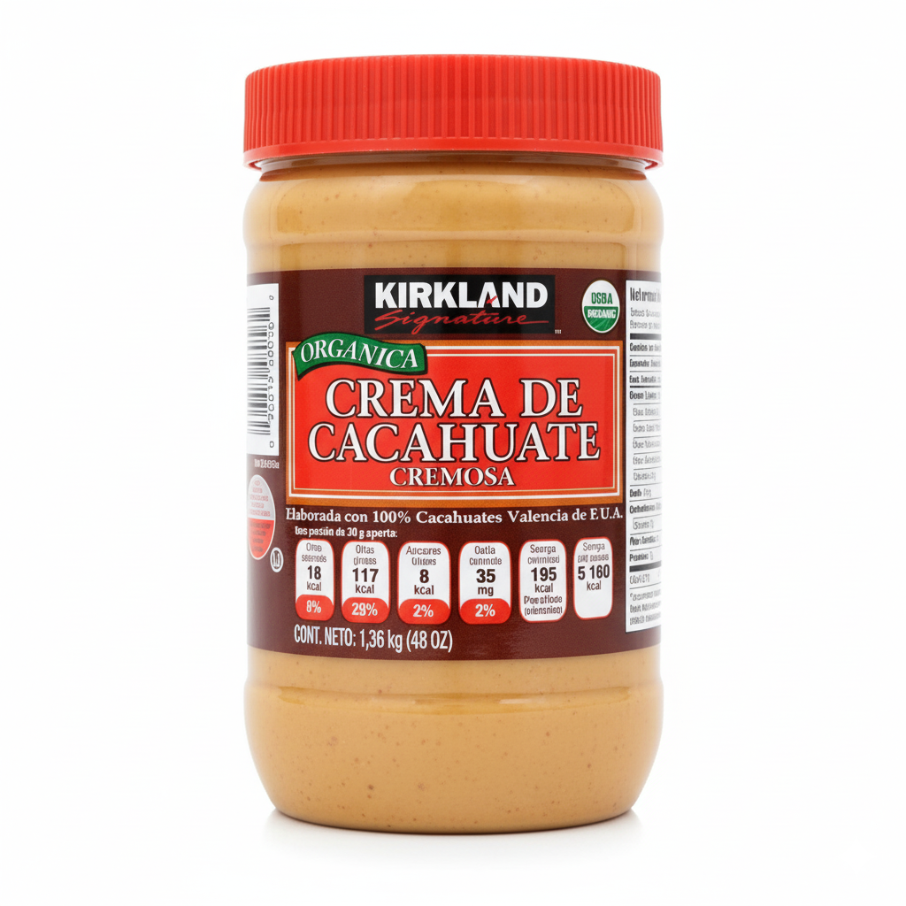 La Crema de Mani Orgánica Cremosa Kirkland Signature es un untable natural y delicioso, ideal para quienes buscan una opción de mantequilla de maní sencilla y de alta calidad. Se distingue por su composición simple y el uso de un tipo específico de maní.Ingredientes e Información NutricionalIngredientes:Cacahuates Valencia Orgánicos Tostados en Seco (100% de E.U.A.)Sal de MarCaracterísticas Destacadas:Orgánica: Certificada por USDA Organic.Cacahuates Valencia: Se elabora con maní de la variedad Valencia, conocido por crecer en racimos de tres o más maníes por vaina y por ser una opción de alta calidad.Procesamiento Mínimo: Solo contiene dos ingredientes (cacahuates y sal) y no tiene azúcares, aceites hidrogenados ni emulsionantes añadidos.Fuente de Nutrientes: Aporta minerales esenciales como zinc, magnesio, potasio y cobre, además de vitamina E y una buena cantidad de proteína y fibra.