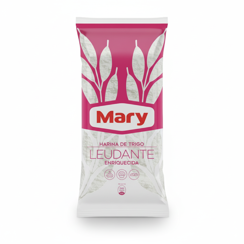 Simplifica tus preparaciones de repostería con la Harina de Trigo Leudante Mary. Este ingrediente esencial ya viene mezclado con la cantidad perfecta de levadura y sal, lo que la hace ideal para obtener resultados esponjosos y suaves en tus horneados, sin necesidad de añadir polvos adicionales. Es perfecta para la elaboración de tortas, muffins, panqueques y cualquier receta que requiera una consistencia ligera y aireada. El práctico empaque de 900g es ideal para el uso en el hogar, garantizándote la máxima conveniencia y resultados profesionales.Ingredientes:Harina de trigo, fosfato dicálcico (leudante), bicarbonato de sodio (leudante), sal y vitaminas (nicotinamida, mononitrato de tiamina, riboflavina, ácido fólico).Aviso de alérgenos: Contiene gluten.Información nutricional (por porción de 30g):Energía: 105 kcalGrasas: 0.6 gGrasas saturadas: 0.2 gCarbohidratos: 22.5 gAzúcares: 0 gProteínas: 2.8 gFibra: 0.8 gSodio: 1.5 mg