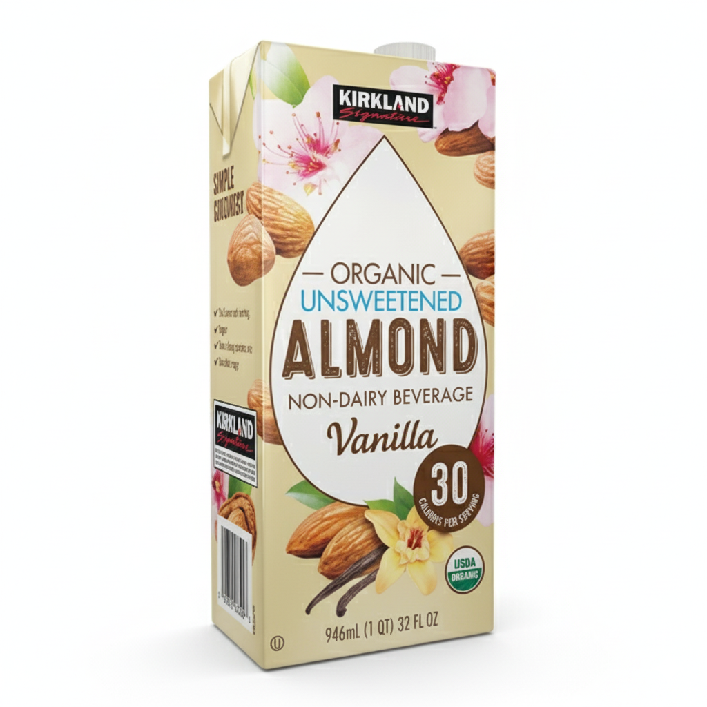 La Bebida de Almendra Orgánica sin Endulzar con sabor a Vainilla de Kirkland Signature es una alternativa no láctea de alta calidad, ideal para quienes buscan una opción baja en calorías y libre de azúcares añadidos. Este producto está elaborado con almendras orgánicas y un ligero toque de vainilla para ofrecer un sabor refrescante y equilibrado. Se presenta en un envase de 946 ml (32 fl oz).Características Clave:Baja en Calorías y Sin Azúcar Añadido: Contiene solo 30 calorıˊas por porción (240 ml) y 0 gramos de azúcar.Libre de Lácteos y Soy: Una excelente opción para personas con intolerancia a la lactosa, alergias a la soja o que siguen dietas veganas.Enriquecida con Vitaminas: Buena fuente de Vitamina E (un antioxidante natural) y Calcio.Uso Versátil: Perfecta para consumir sola, con cereales, en café, tés o como base para smoothies y recetas de repostería.IngredientesBase de almendra orgánica (agua filtrada, almendras orgánicas), sabor orgánico a vainilla, sal marina, lecitina de girasol, goma de algarrobo orgánica, goma gellan, palmitato de vitamina A, ergocalciferol (vitamina D2), acetato de DL-alfa tocoferilo (vitamina E), riboflavina (vitamina B2), gluconato de zinc, cianocobalamina (vitamina B12).Alérgenos: Contiene almendras (frutos de cáscara). El producto es libre de lácteos y soja.