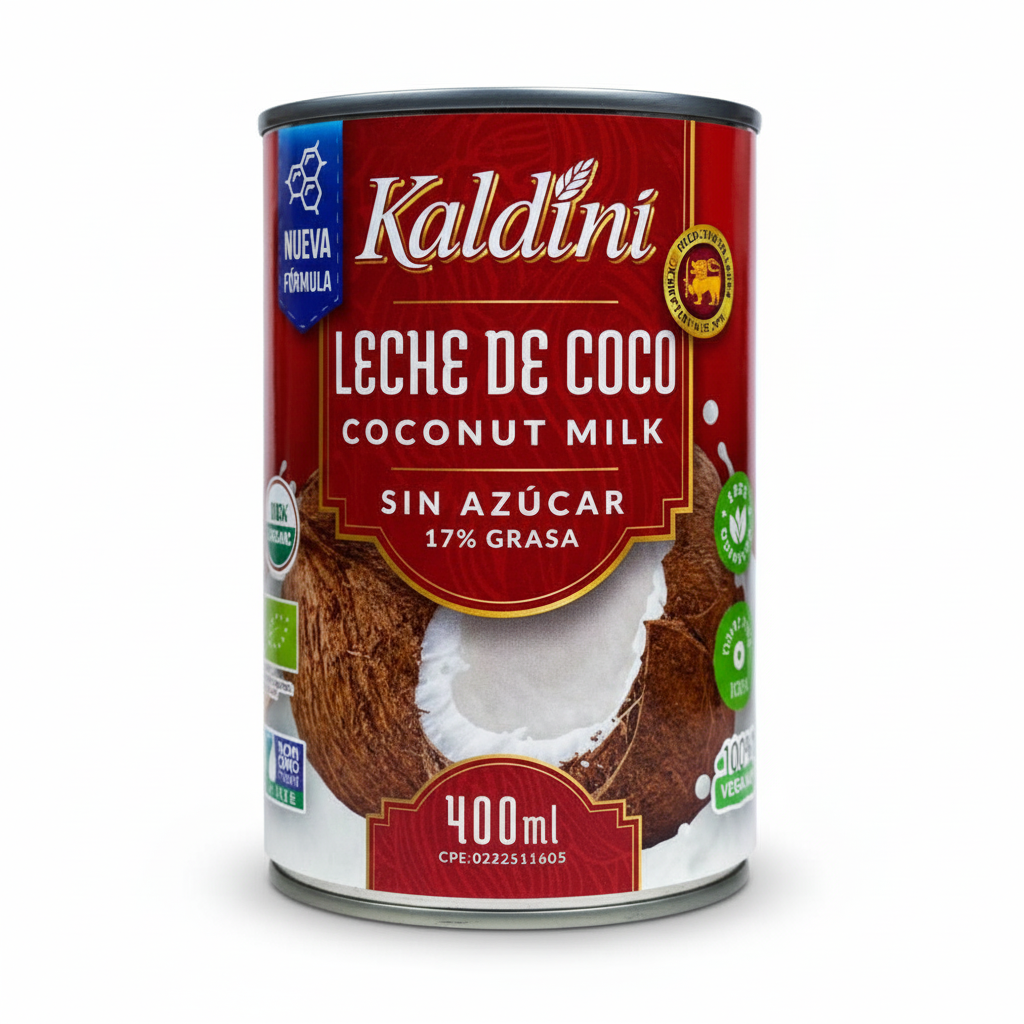 La Leche de Coco Kaldini en formato de 400 ml con un contenido de grasa de alrededor del 17% es un producto esencial en la cocina asiática y tropical. Se trata de un extracto cremoso obtenido al prensar la pulpa blanca del coco maduro con agua. Este nivel de grasa la clasifica como una leche de coco de uso general o «todo uso», ideal para dar cuerpo y sabor a una gran variedad de platos.Ingredientes:Extracto de Coco (Pulpa de coco y Agua).Agua.Estabilizantes y Emulsionantes: Puede contener aditivos como Carboximetilcelulosa Sódica, Goma Xantana, Goma Guar o Polisorbato para mantener una consistencia uniforme y evitar la separación de la grasa.Conservantes: Puede incluir Metabisulfito de Potasio o Sulfito.Nota Importante: Generalmente, esta versión enlatada no contiene azúcar añadido, a diferencia de la crema de coco.Perfil y Usos:Contenido de Grasa (17%): Aporta una textura rica y cremosa sin ser tan espesa como la crema de coco (que tiene un grasa ≥20%).Usos Culinarios: Es fundamental para curry tailandés, sopas, guisos, arroces y salsas. También es excelente para postres, helados y coctelería (como la Piña Colada).Propiedades: Es una alternativa vegana y sin lactosa a la nata o leche de origen animal. Es rica en Triglicéridos de Cadena Media (TCM), un tipo de ácido graso que se metaboliza rápidamente como fuente de energía.