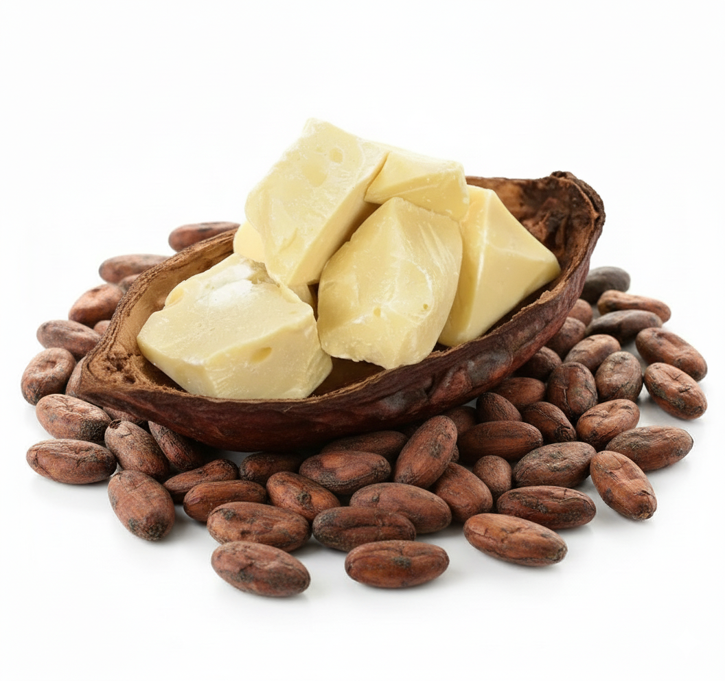 La manteca de cacao es la materia grasa 100% vegetal que se obtiene al prensar la pasta o licor de cacao, separándola de la torta de cacao (que luego se muele para hacer cacao en polvo). Se caracteriza por su color amarillo claro o marfil y un sutil aroma a chocolate.Es una grasa única debido a sus características polimórficas, lo que significa que tiene un punto de fusión específico (alrededor de 34∘C) que es justo por debajo de la temperatura corporal (37∘C). Esta propiedad es crucial: le da al chocolate su textura firme a temperatura ambiente y esa capacidad de «fundirse en la boca» sin dejar una sensación cerosa.