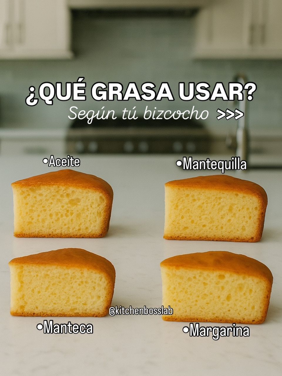 La elección de la grasa es clave para obtener la textura y el sabor deseado en tus pasteles. Aquí te explicamos las diferencias y los resultados que puedes esperar de cada una:Aceite: El aceite es ideal si quieres un pastel alto, muy húmedo y esponjoso. La miga suele ser más abierta en comparación con las otras grasas.Mantequilla: La mantequilla le da un sabor más intenso a tus pasteles. El resultado es una miga fina y uniforme.Manteca: Al usar manteca, obtendrás un pastel con más volumen, aunque puede resultar un poco más seco. La miga tiende a ser más gruesa.Margarina: Si buscas una textura más tierna y compacta, la margarina es una excelente opción. A menudo, el resultado puede tener pequeñas burbujas de aire.