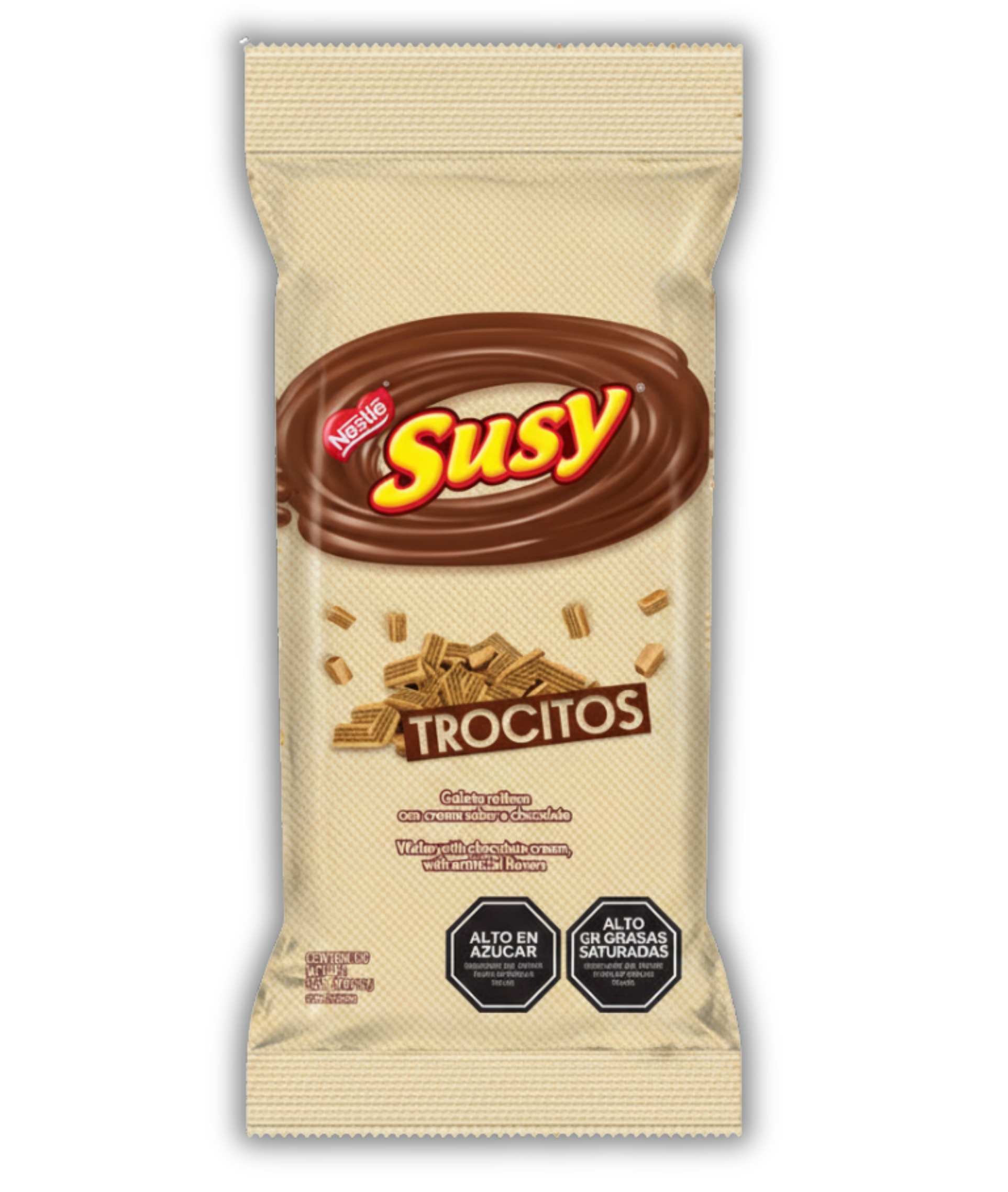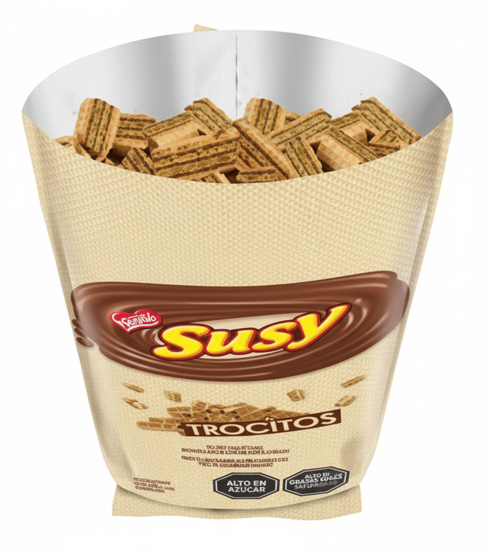 Dale a tus postres el sabor clásico y la textura crujiente de la galleta Susy con este práctico formato troceado de 240g. Cada pieza es una combinación perfecta de la galleta wafer tradicional de Venezuela con una cremosa capa de chocolate, ahora lista para usar directamente en tus creaciones.El Susy troceado es ideal para agregar como topping a helados, malteadas y brownies, o como ingrediente para dar un toque especial a rellenos de pasteles y cheesecakes. Su versatilidad lo convierte en un ingrediente imprescindible para cualquier repostería.Ingredientes:Harina de trigo, azúcar, grasa vegetal, cacao en polvo, aceite de coco, sólidos de leche, lecitina de soya, sal, saborizante artificial, bicarbonato de sodio y vainillina.Aviso de alérgenos: Este producto contiene gluten, leche y soya. Puede contener trazas de maní y nueces de árbol.Información Nutricional (por 100g de producto)Energía: 500 kcalGrasas totales: 24.5gCarbohidratos: 66.5gAzúcares: 39.7gProteínas: 5.8gSal: 0.2g