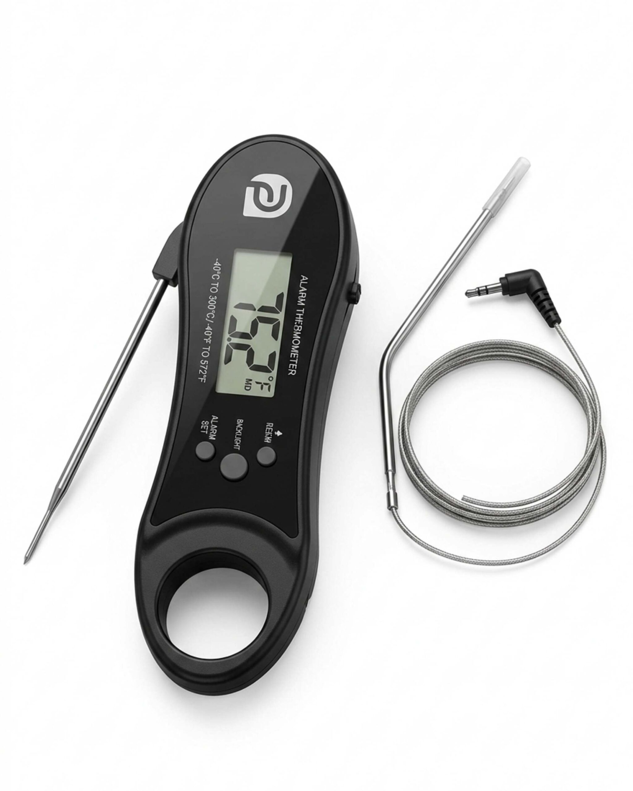 El Termómetro Digital Profoods es un instrumento de medición de alta gama diseñado para el monitoreo crítico de temperaturas en entornos de producción profesional. Este modelo destaca por su sistema de sonda dual: una sonda plegable integrada para lecturas instantáneas y una sonda externa con cable de acero inoxidable para monitoreo continuo dentro del horno o en cocciones prolongadas.